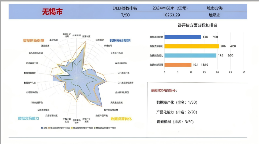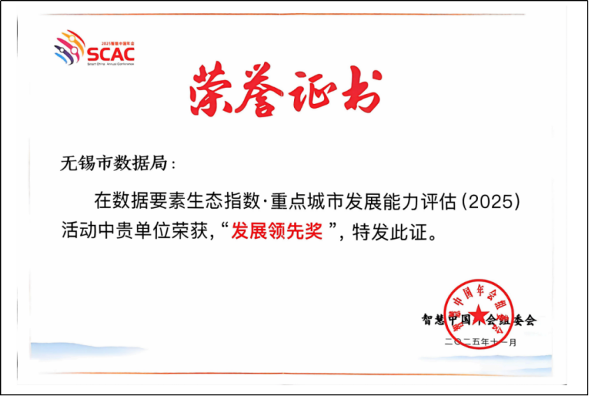 近期,2025智慧中国年会在北京召开,无锡市数据局在数据要素生态指数·重点城市发展能力评估(2025)活动中成功荣获“发展领先奖”,DETT(Data Element Ecosystem Index)指数排名全国第七。
