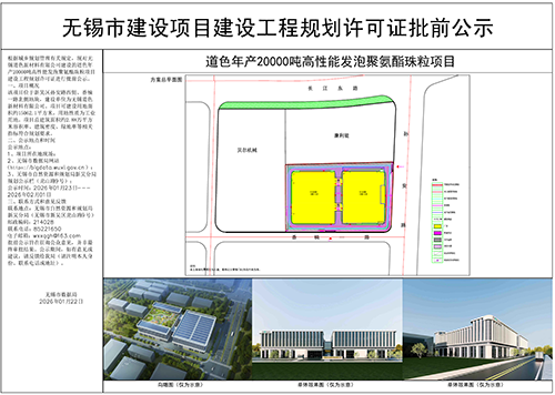公示名称:无锡道色新材料有限公司建设的道色年产20000吨高性能发泡聚氨酯珠粒项目建设工程规划许可证批前公示